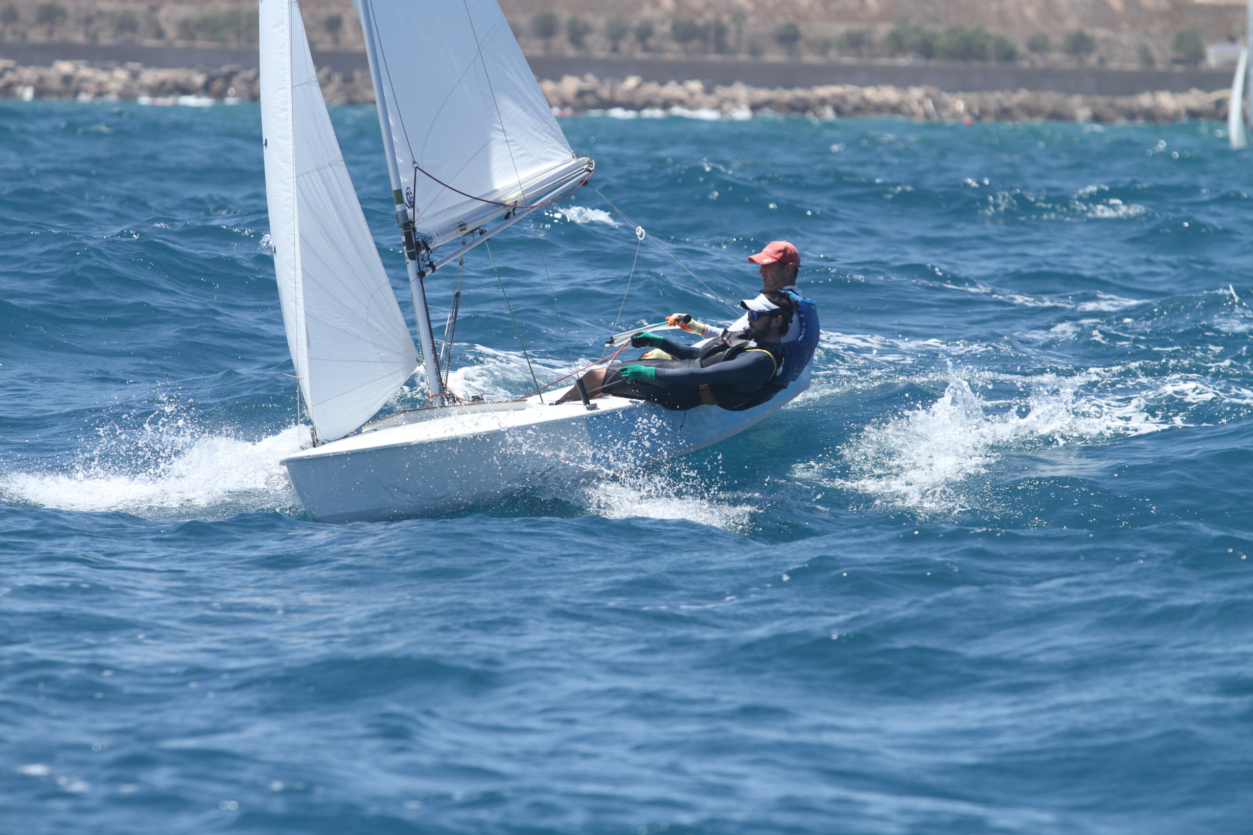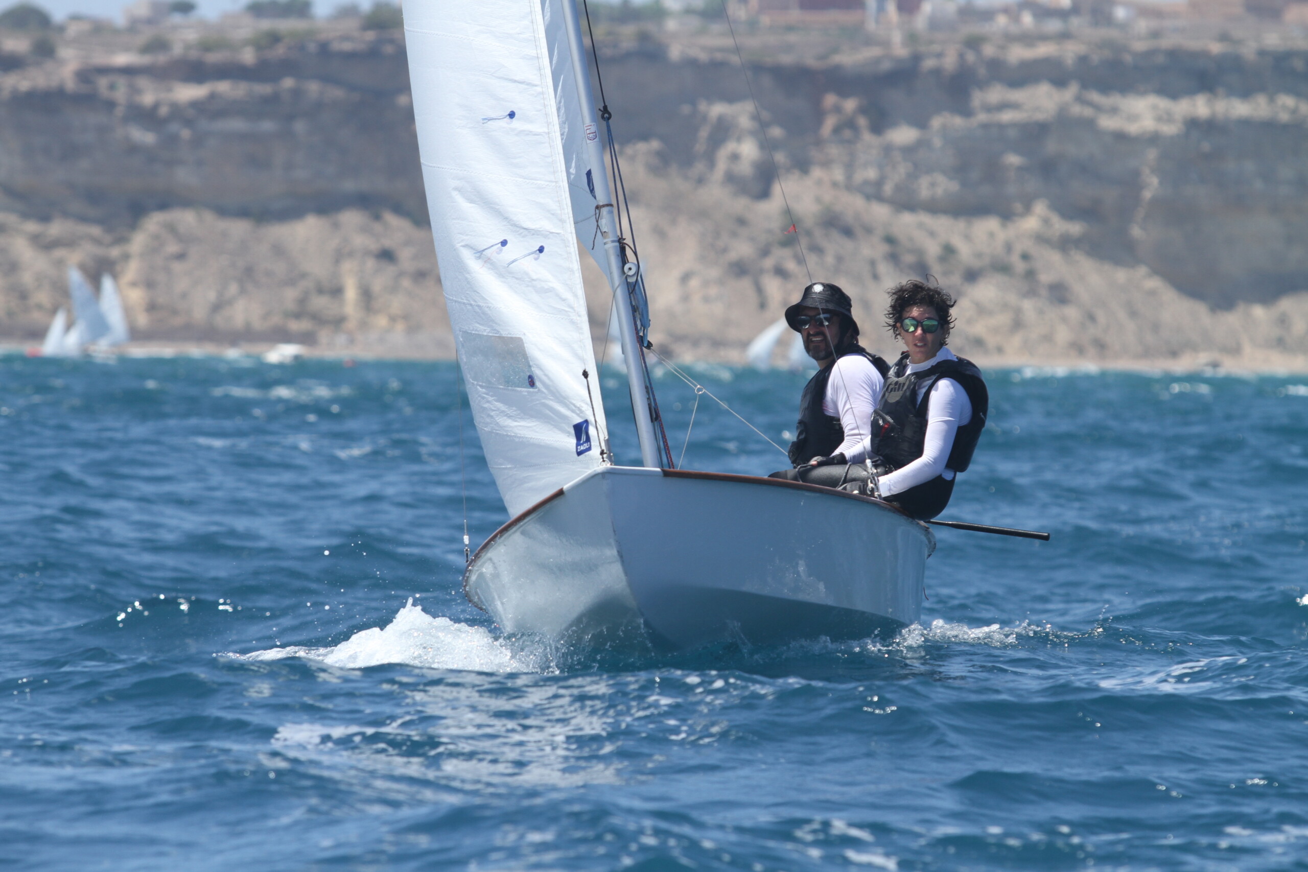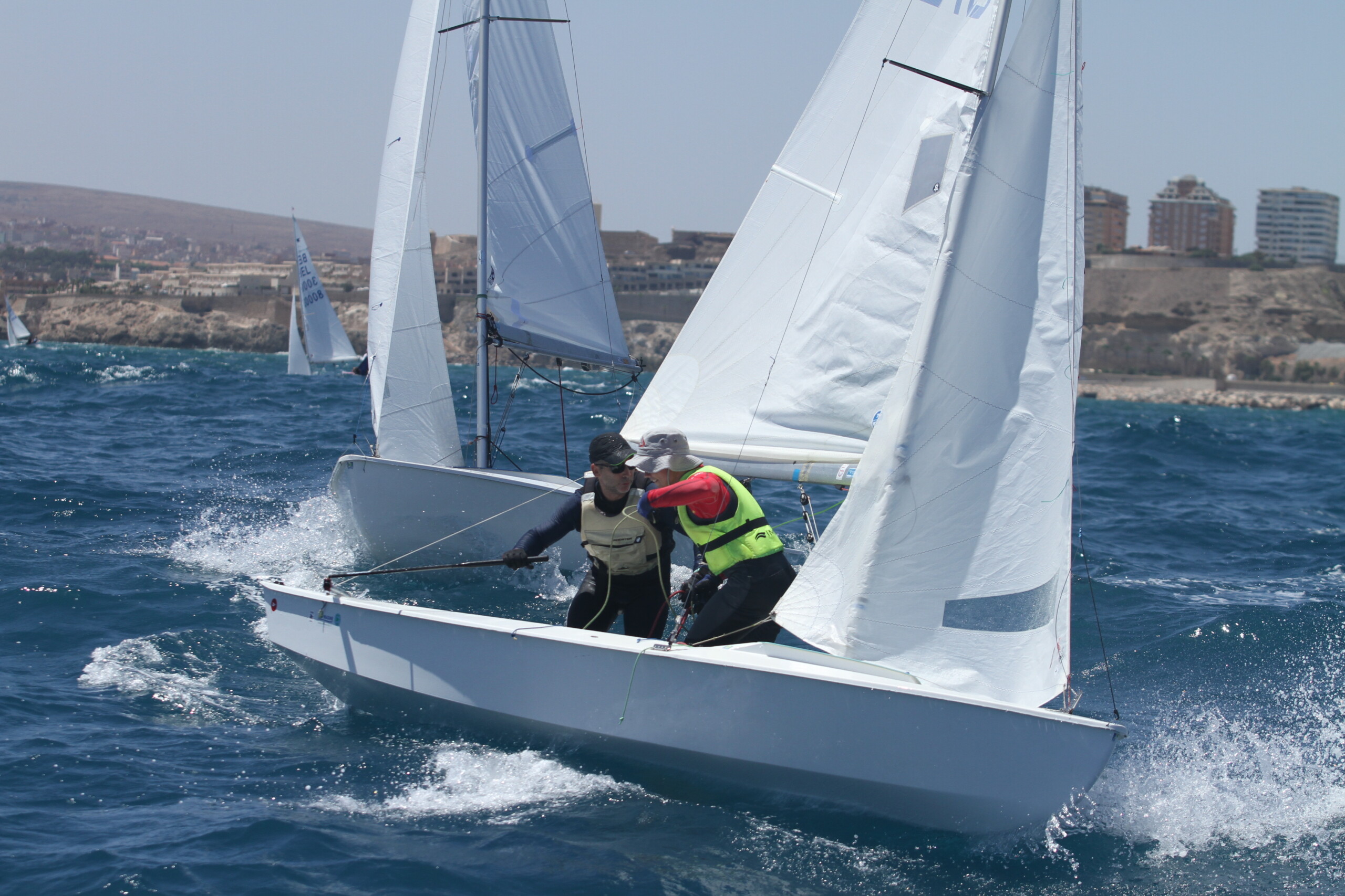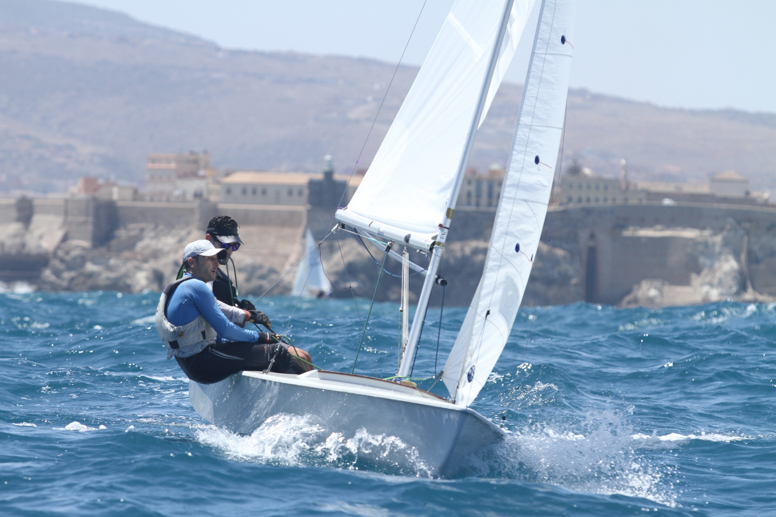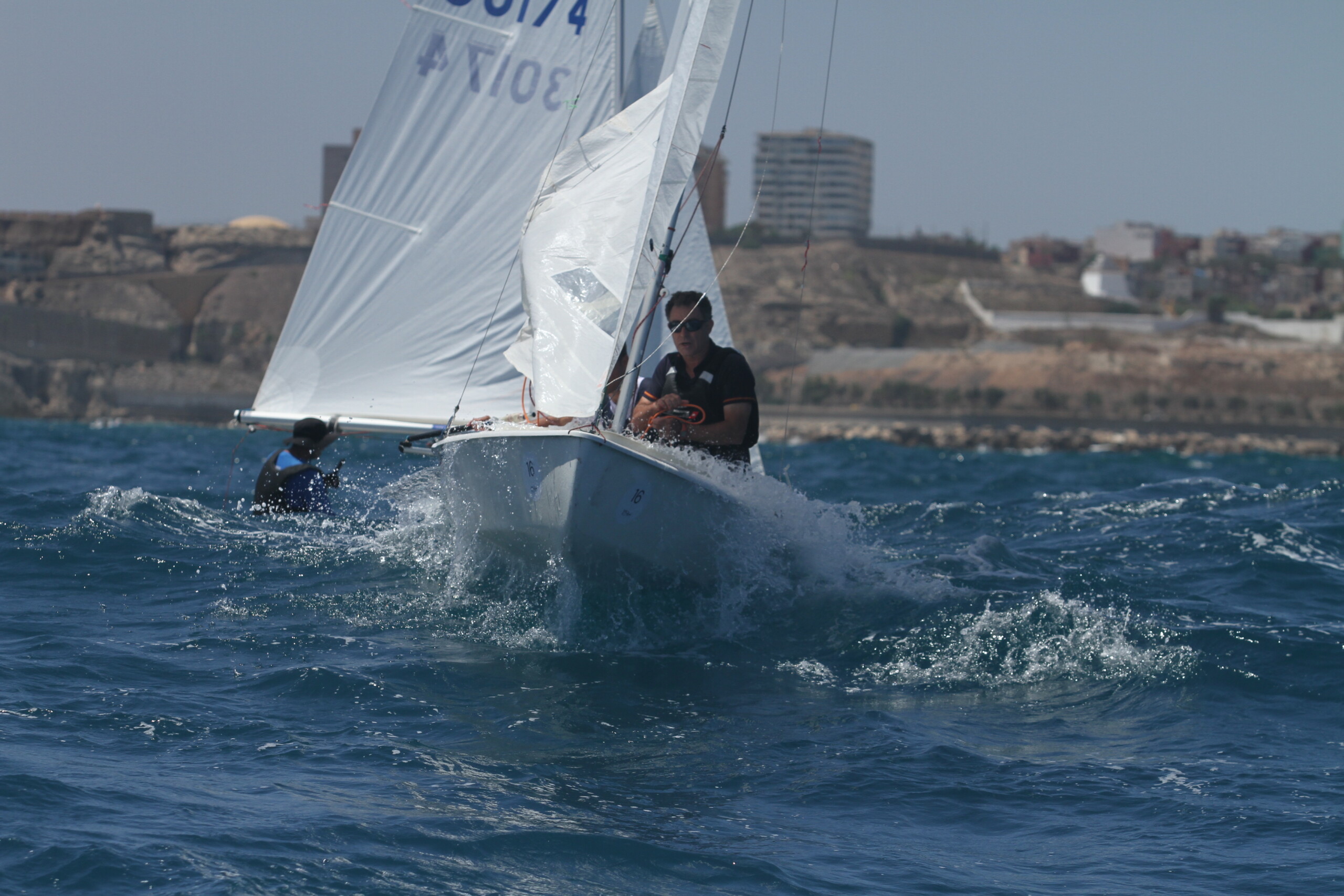 Un inicio de regata que se ha saldado con dos mangas, con vientos de levante que han oscilado entre siete y trece nudos con mucha corriente y oleaje. El Comité, liderado por Fidel Martínez, inició la jornada al filo de las 13:30 horas, logrando iniciar la competición para así establecer la clasificación provisional.