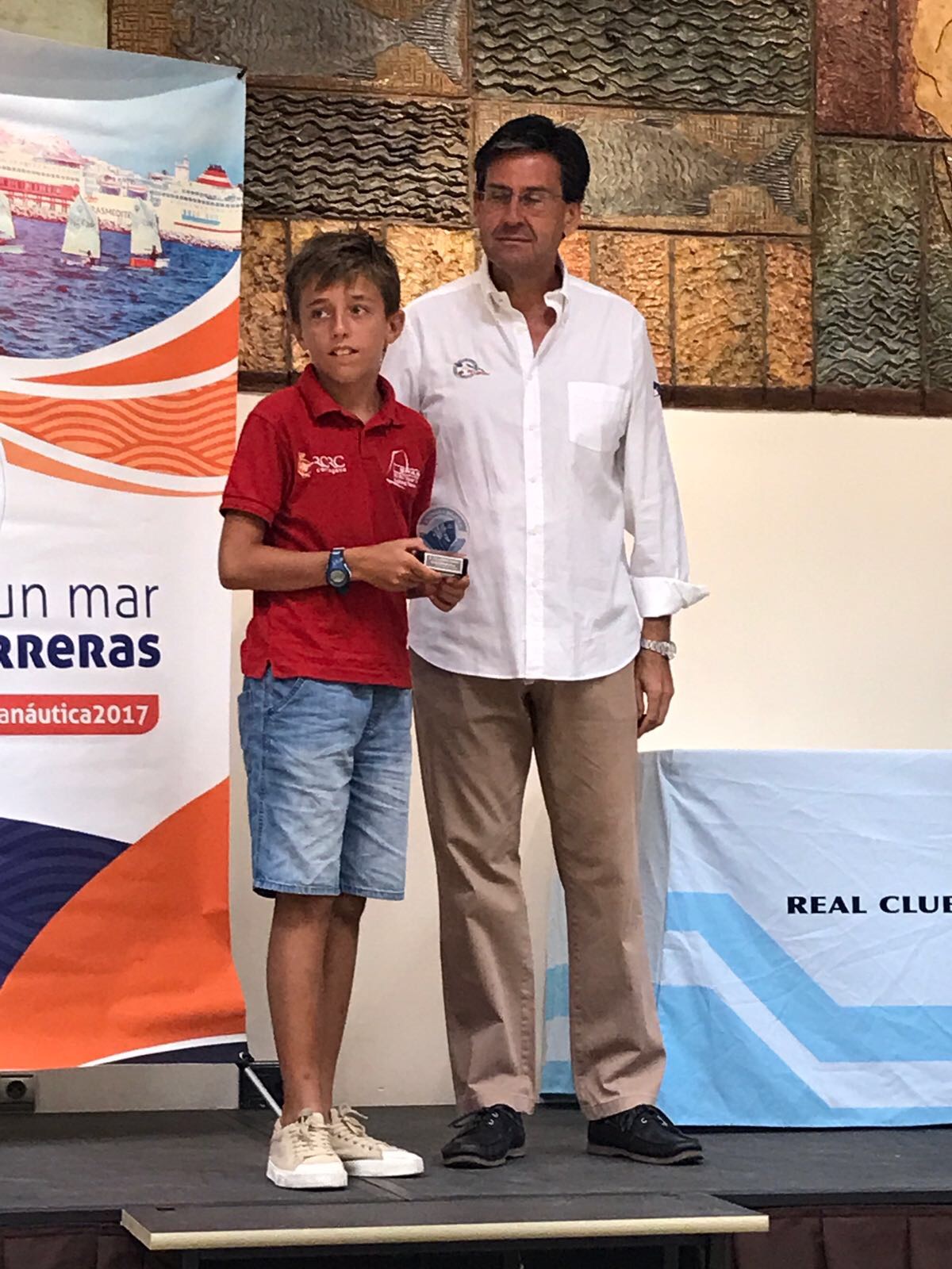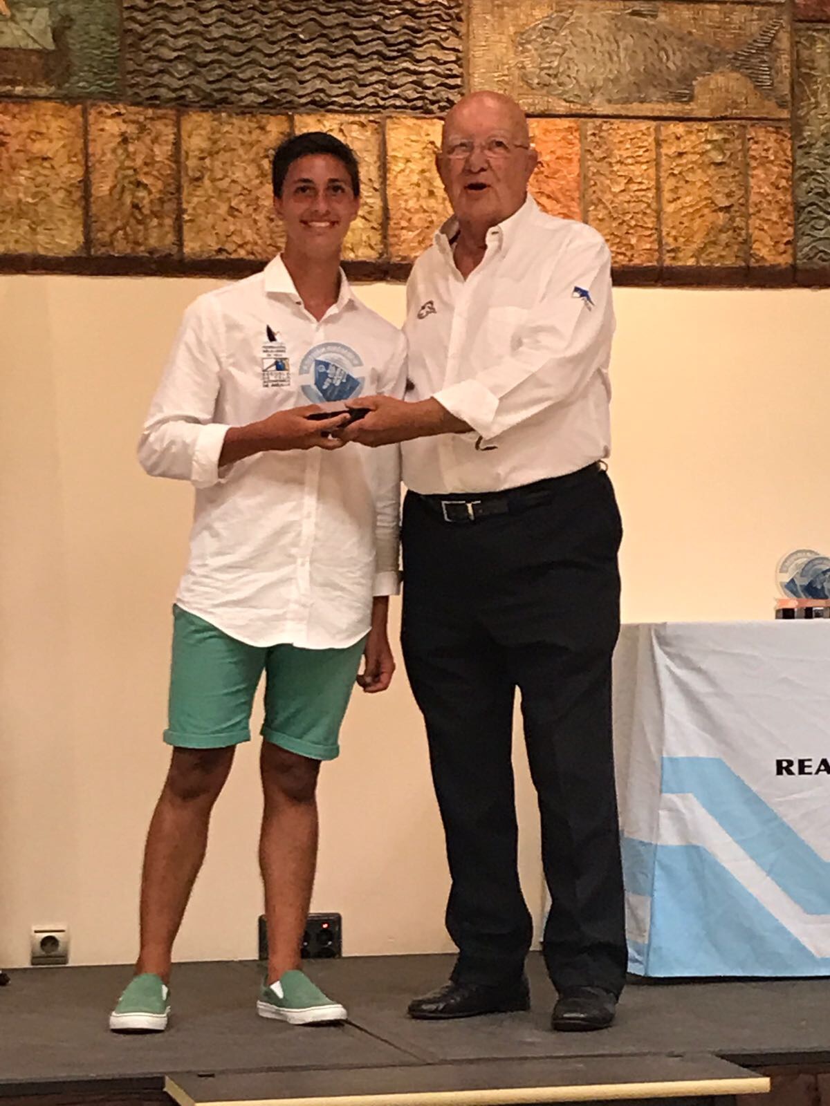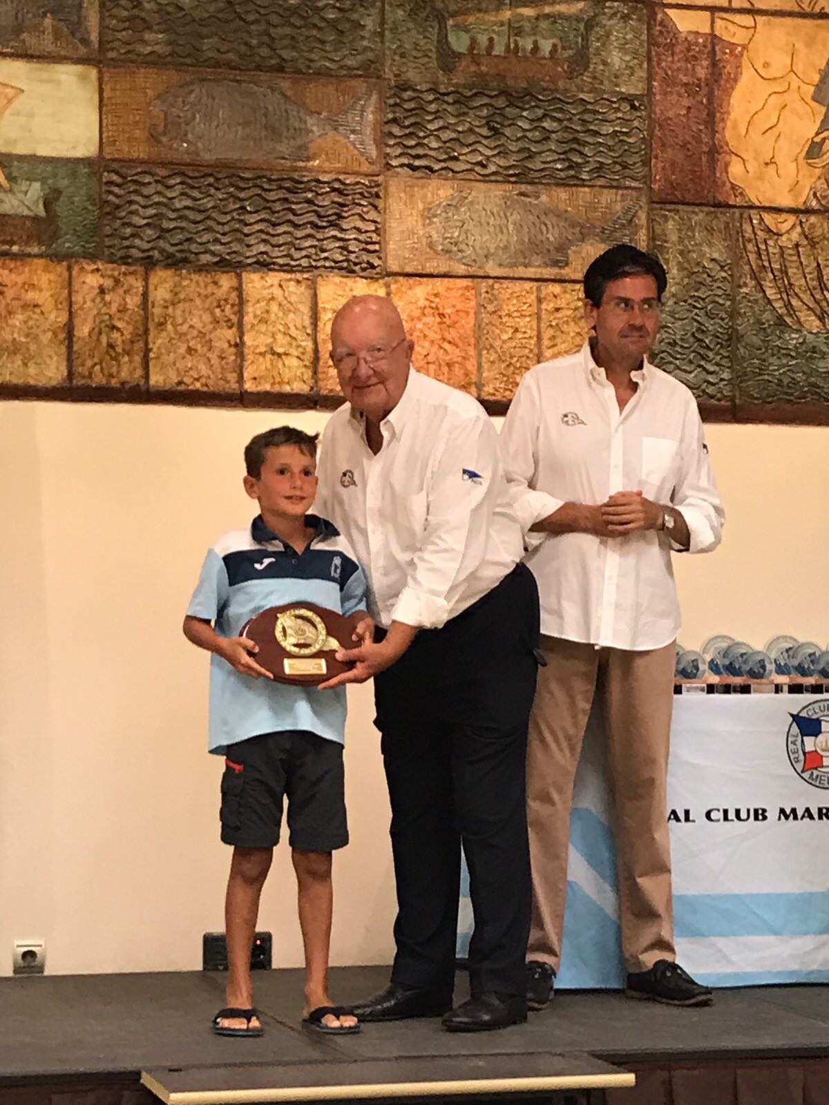 El Club Marítimo ha comenzado el acto realizando un reconocimiento a los clubes peninsulares que han tomado parte este año en la Semana Náutica de Vela Ligera. Así, regatistas de los clubes RCR Cartagena, Club de Mar de Almería, CN Almerimar, RCN Adra, RCN Motril, RCN El Candado y CNM Benalmádena han recogido una metopa.