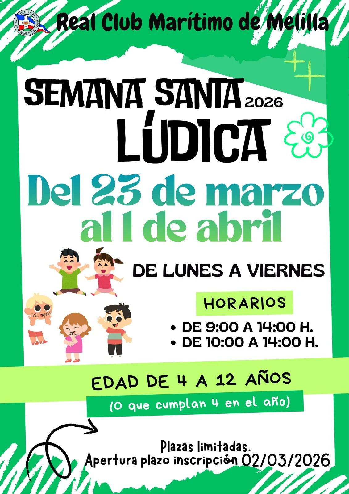 El Real Club Marítimo de Melilla pondrá en marcha, un año más, sus tradicionales jornadas de actividades infantiles con motivo de la Semana Santa, una iniciativa dirigida a los socios más jóvenes de la entidad y que estará coordinada por un equipo de monitoras especializadas.
