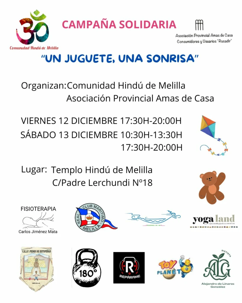 La otra forma, de sumarte a esta corriente es acudiendo con tu donación al Tempo Hindú de Melilla, en la calle Padre Lerchundi 18, tanto la tarde de este viernes 13 de diciembre, entre las 17:30 y 20 horas, como mañana sábado de 10:30 h a13:30 h y de 17:30 h a 20:00 horas.