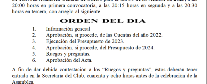 El Real Club Marítimo de Melilla convoca Asamblea General Ordinaria de Socios para el día 30 de noviembre de 2023, a las 20:00 horas en primera convocatoria, a las 20:15 horas en segunda y a [...]