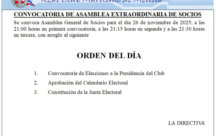 Convocatoria de Asamblea Extraordinaria de Socios, miércoles 26 de noviembre de 2025
