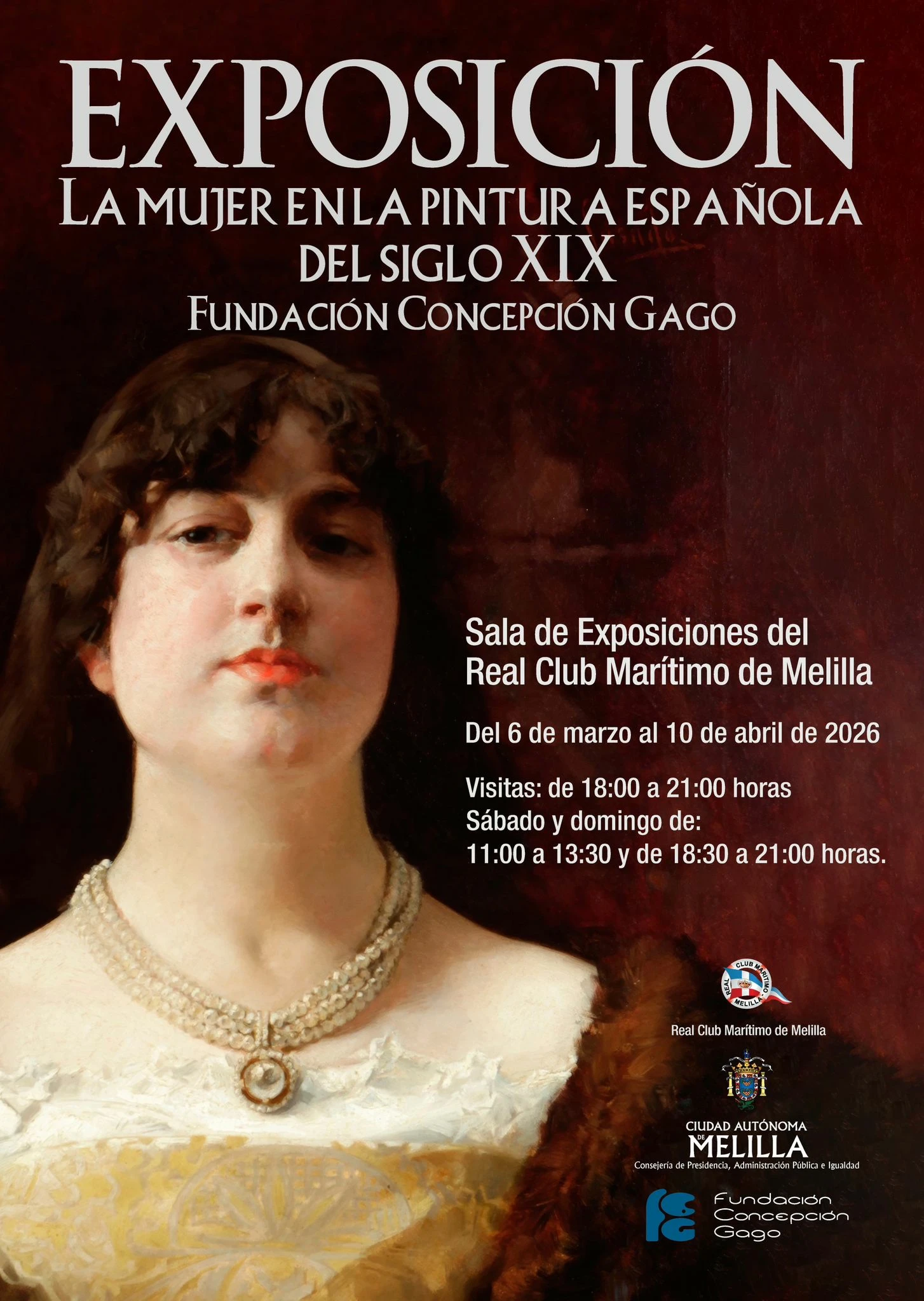 Este viernes 6 de abril, a las 19:30 horas, se inaugura en la Sala de Exposiciones del Real Club Marítimo de Melilla la muestra “La mujer en la pintura española del siglo XIX”, organizada por la Fundación Concepción Gago y con la colaboración de la Viceconsejería de Igualdad y Mujer de la ciudad autónoma. La iniciativa forma parte de las actividades culturales programadas con motivo de la conmemoración del Día Internacional de la Mujer.