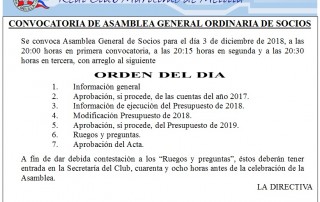 La Junta Directiva del Real Club Marítimo de Melilla ha acordada, en reunión celebrada este miércoles 14 de noviembre, convocar para el próximo lunes 3 de diciembre de 2018 Asamblea [...]