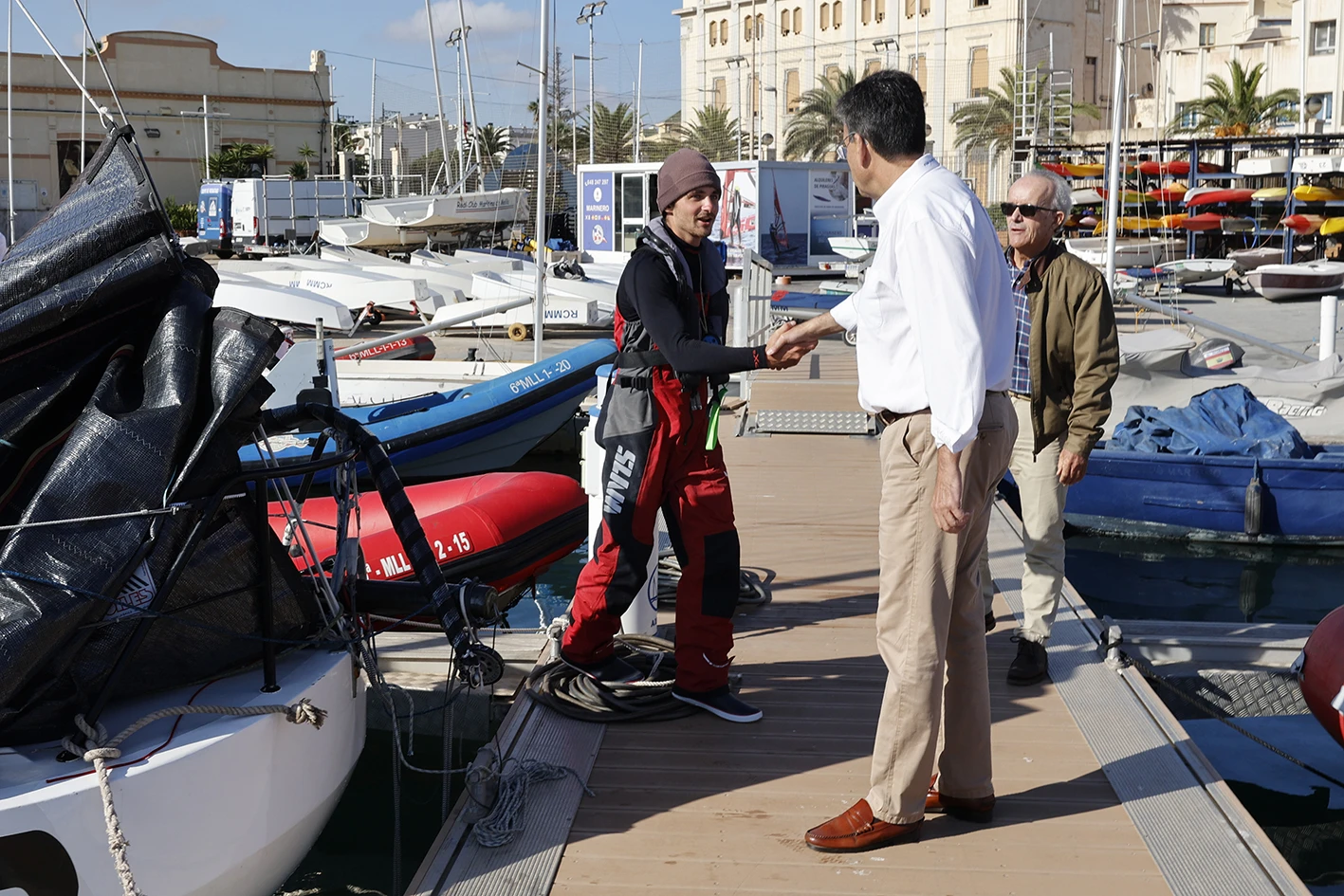 El presidente del Real Club Marítimo de Melilla, Jerónimo Pérez, ha sido el encargado de dar la bienvenida a la primera tripulación que ha alcanzado la ciudad de Melilla. Desde el barco Comité estaba presente frente a la nueva playa de Horcas Coloradas, cuando la embarcación ‘Optimum’ cruzaba el collarín de llegada. En ese momento, pasaban unos minutos de las diez de la mañana de este martes, con viento Levante y hasta catorce nudos en la zona del cabo Tres Forcas.